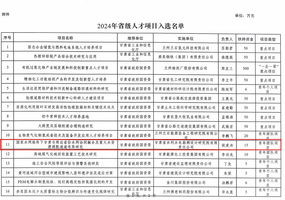 省水电设计院丨公司又一项目入选甘肃省2024年省级人才项目名单