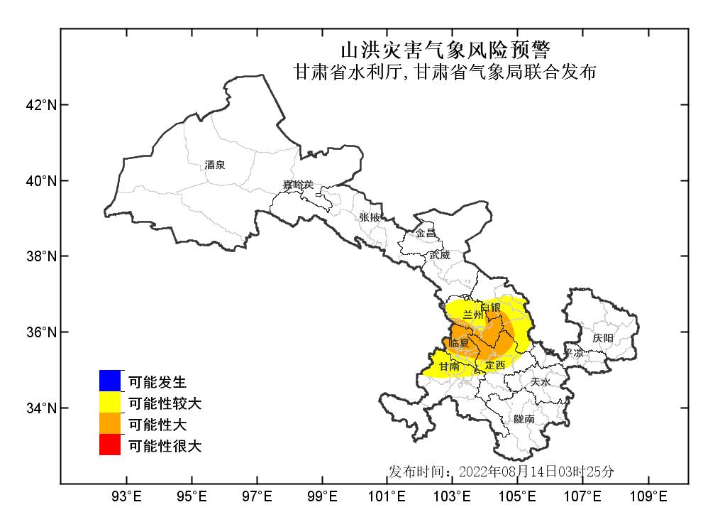 甘肃省水利厅、甘肃省气象局于2022年08月14日03时55分联合发布山洪灾害气象风险橙色预警:预计,08月14日04时至08月14日16时,白银市平川区、景泰县,武威市天祝县,定西市通渭县、陇西县、漳县,甘南州临潭县、合作市、卓尼县、夏河县地区发生山洪灾害可能性较大(黄色预警);兰州市城关区、七里河区、西固区、安宁区、红古区、永登县、兰州新区、皋兰县、榆中县,白银市白银区、靖远县、会宁县,定西市安定区、渭源县、临洮县,临夏州临夏市、临夏县、康乐县、永靖县、广河县、和政县、东乡县、积石山县局地发生山洪灾害可能性大(橙色预警)。请上述地区注意做好实时监测、防汛预警和转移避险等防范工作。
