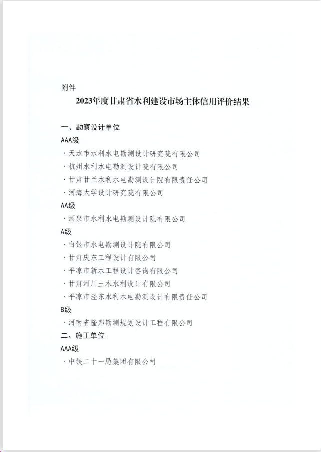 关于2023年度甘肃省水利建设市场主体信用评价结果的公示