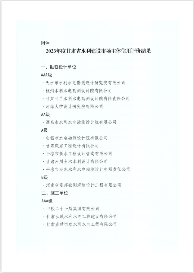 bob(中国)关于2023年度甘肃省水利建设市场主体信用评价结果的公告
